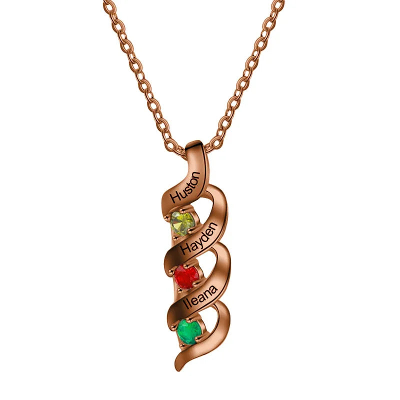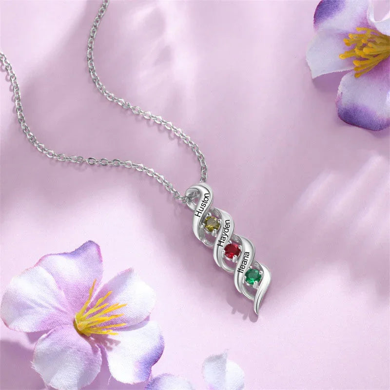 Celebrate the special people in your life with our Elegant Personalized Birthstone Necklace. Designed with intertwining curves, each layer features a name engraving and a sparkling birthstone, symbolizing love, family, and unity. Crafted in high-quality silver, it offers a radiant shine and timeless charm that complements any look.