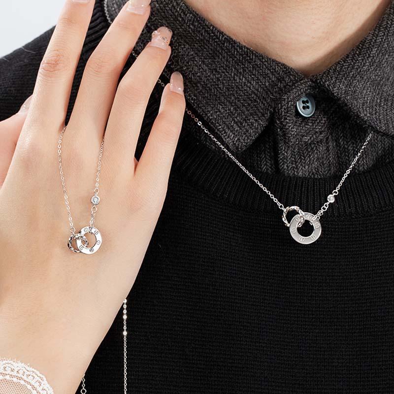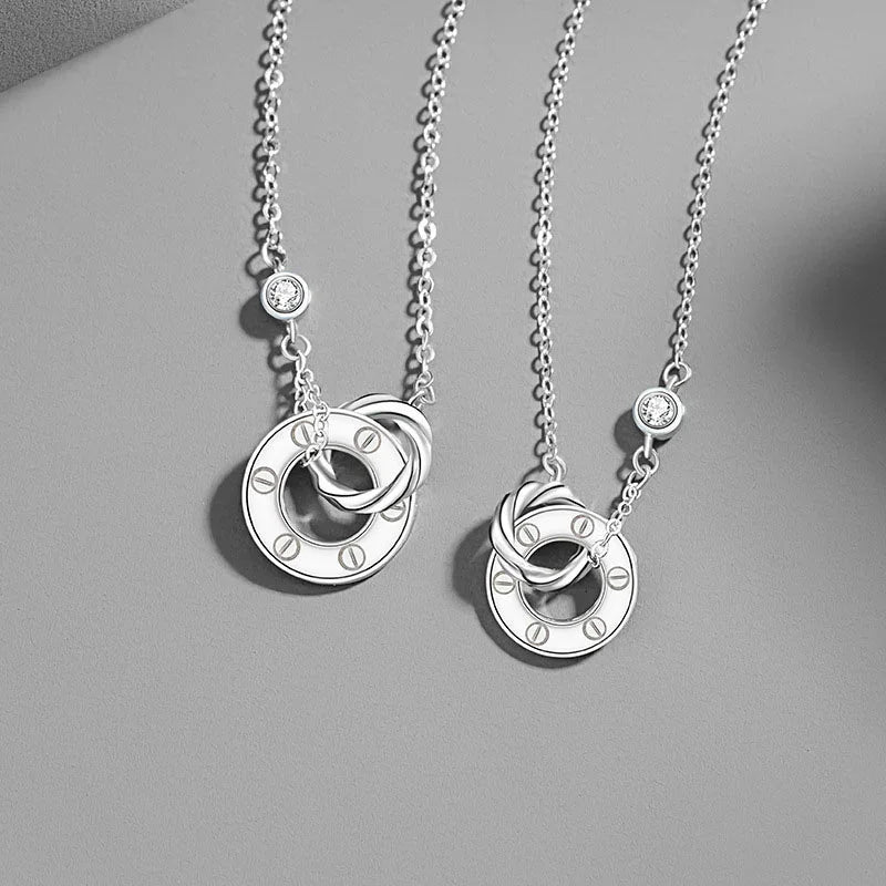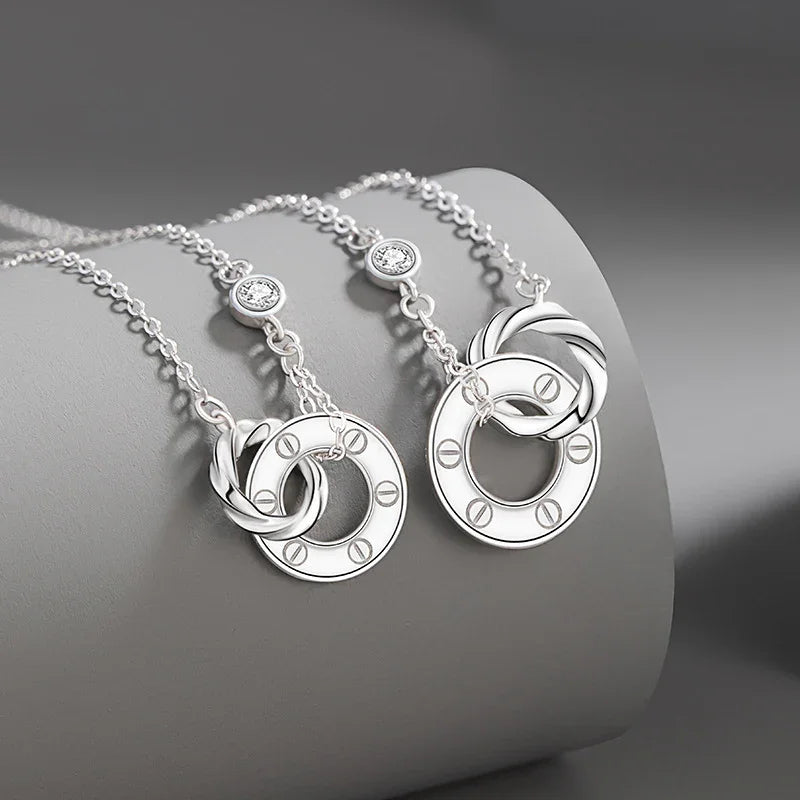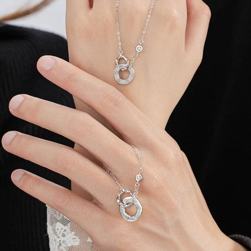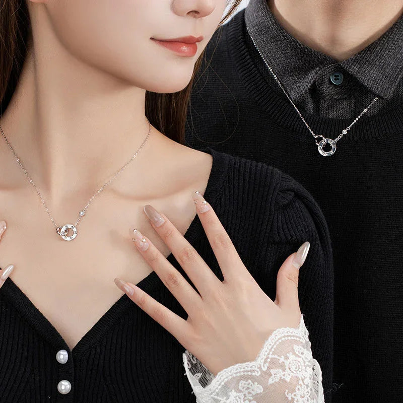 Celebrate a love that lasts forever with our Endless Elegance Couple Circle Necklace. The interlocking circle design represents unity and connection, beautifully accented with a shimmering gemstone for a touch of sophistication. Expertly crafted in silver, it exudes timeless charm and refined style.