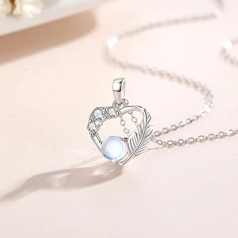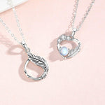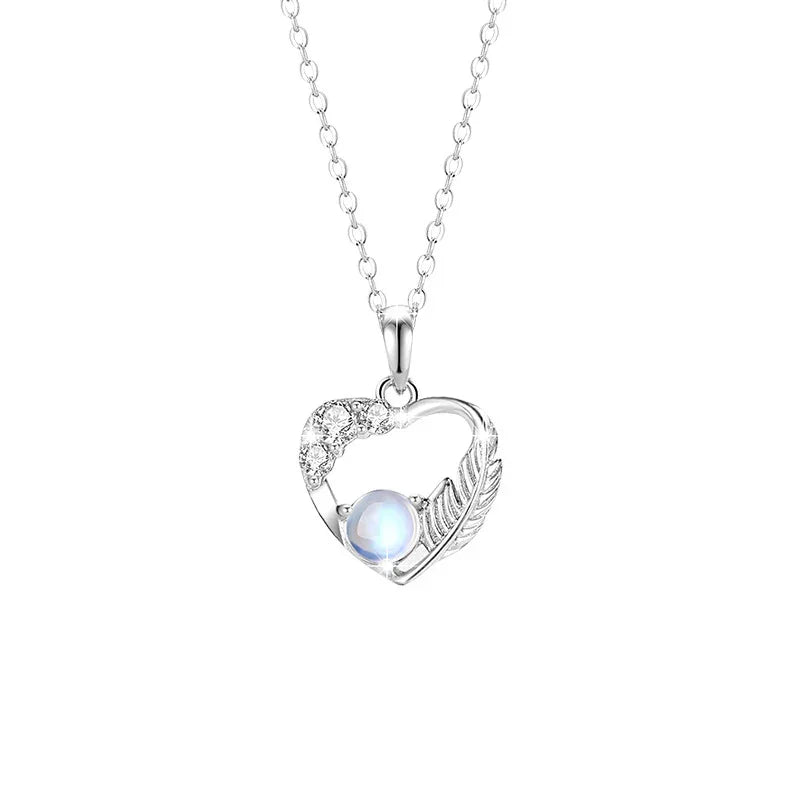 A pair of sterling silver couple necklaces. One features a delicate heart-shaped pendant adorned with small crystals and a luminous gemstone, accented with a feather motif. The other has a circular pendant wrapped with a feather design. Both are displayed on fine silver chains against a white background.
