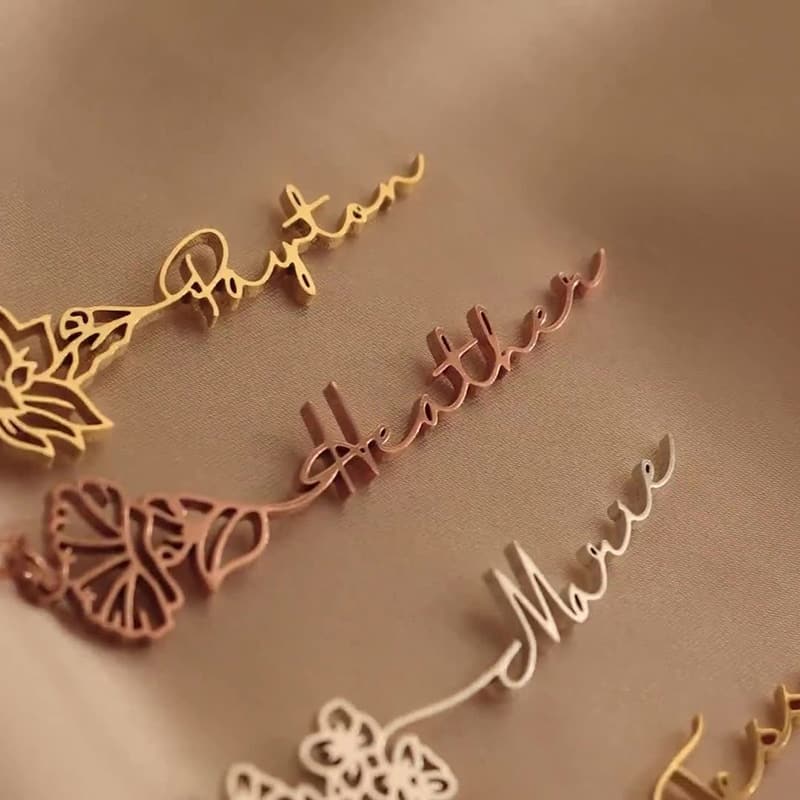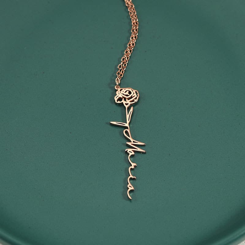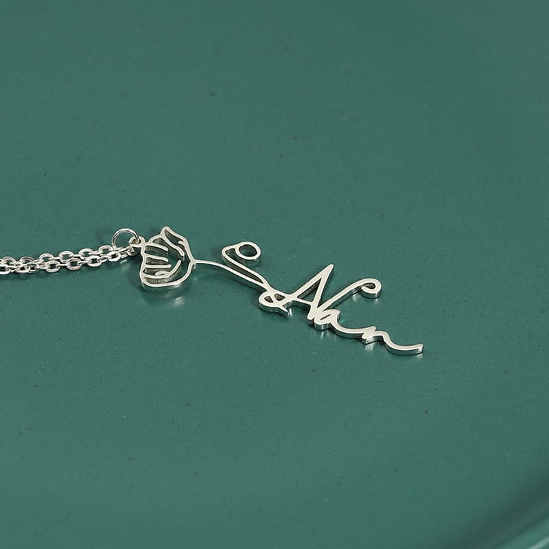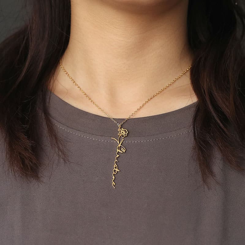 Unit price perThe Everbloom Birth Flower Necklace captures the quiet beauty of nature with a deeply personal meaning. Featuring a delicately outlined birth flower paired with an elegant custom name, this necklace symbolizes growth, individuality, and the moments that shape who we are. Each flower represents a birth month, making the design both timeless and uniquely yours. Crafted with care from titanium steel, this piece offers lasting shine and durability while remaining light and comfortable for everyday wear. Thoughtfully designed to honor life’s milestones and meaningful connections, it’s a keepsake made to be worn close to the heart.