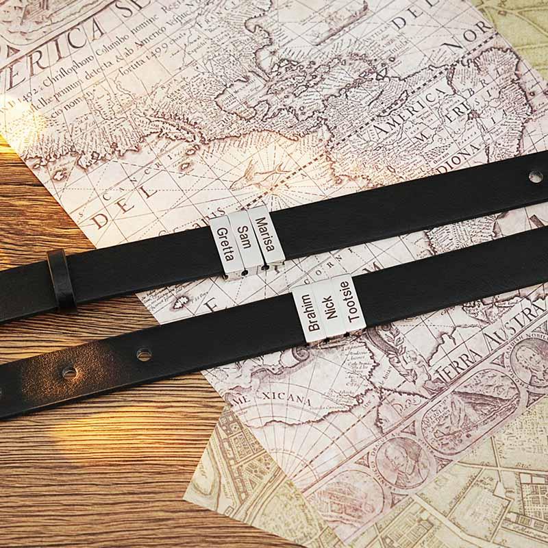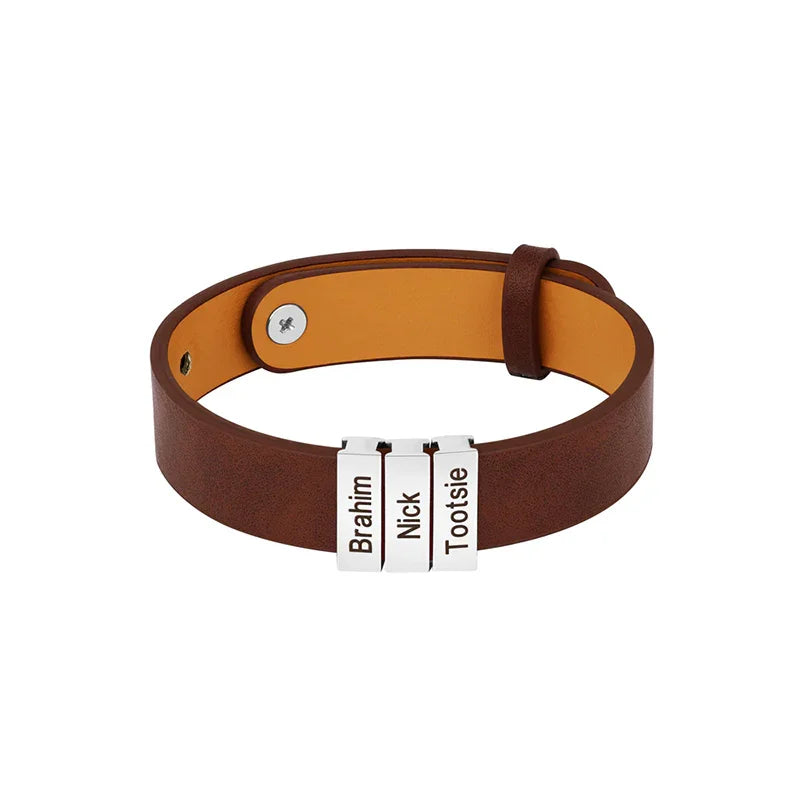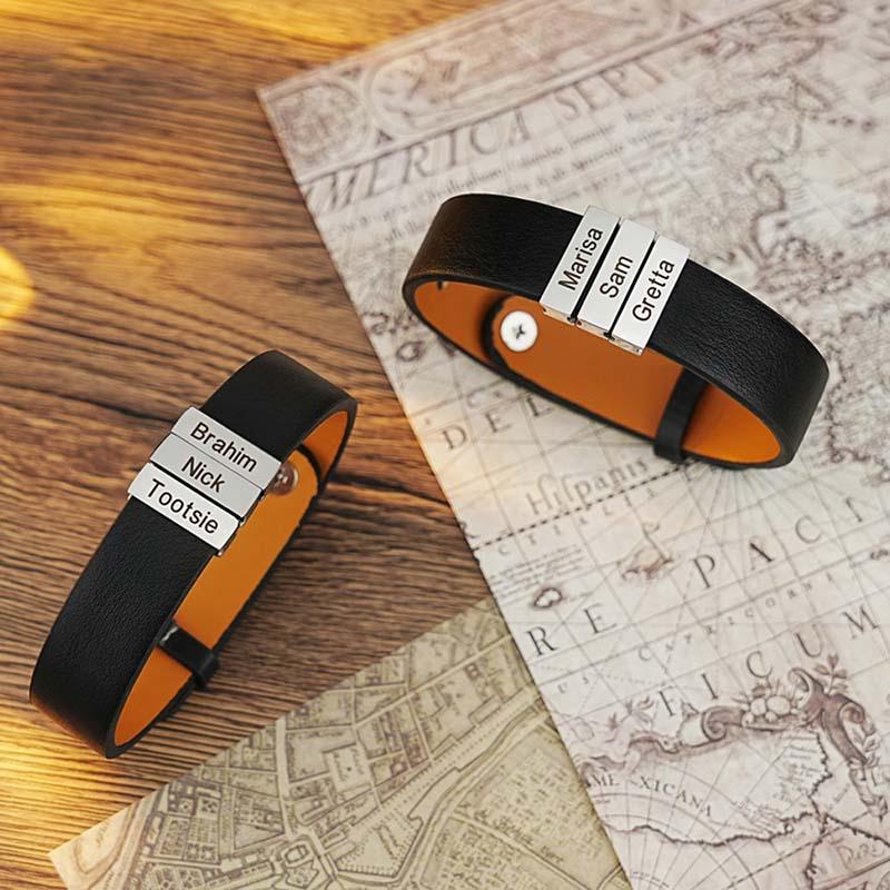 Make a bold statement with our Men's Personalized Minimalist Name Plate Bracelet. Designed with a sleek leather strap and customizable name plates, this bracelet blends modern simplicity with personal meaning. Add engraved names or special words to create a unique and meaningful accessory.