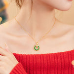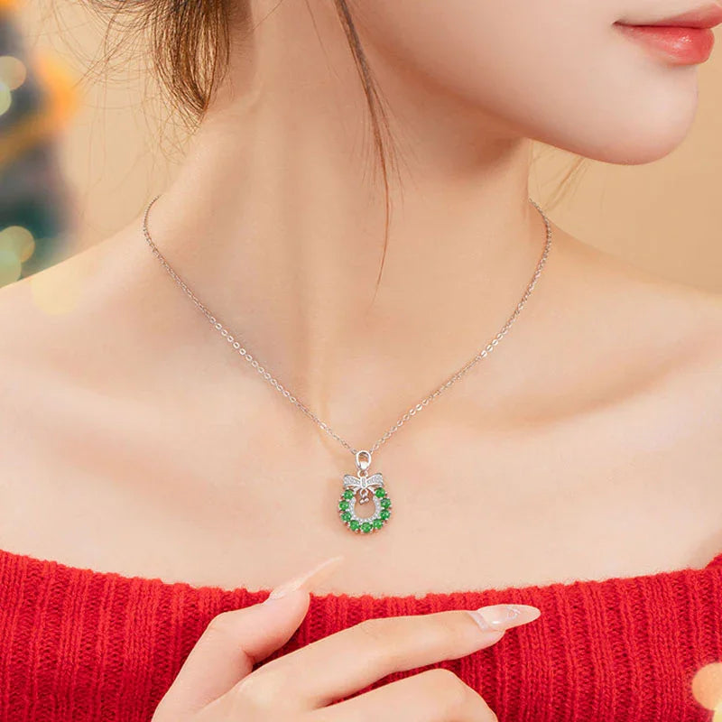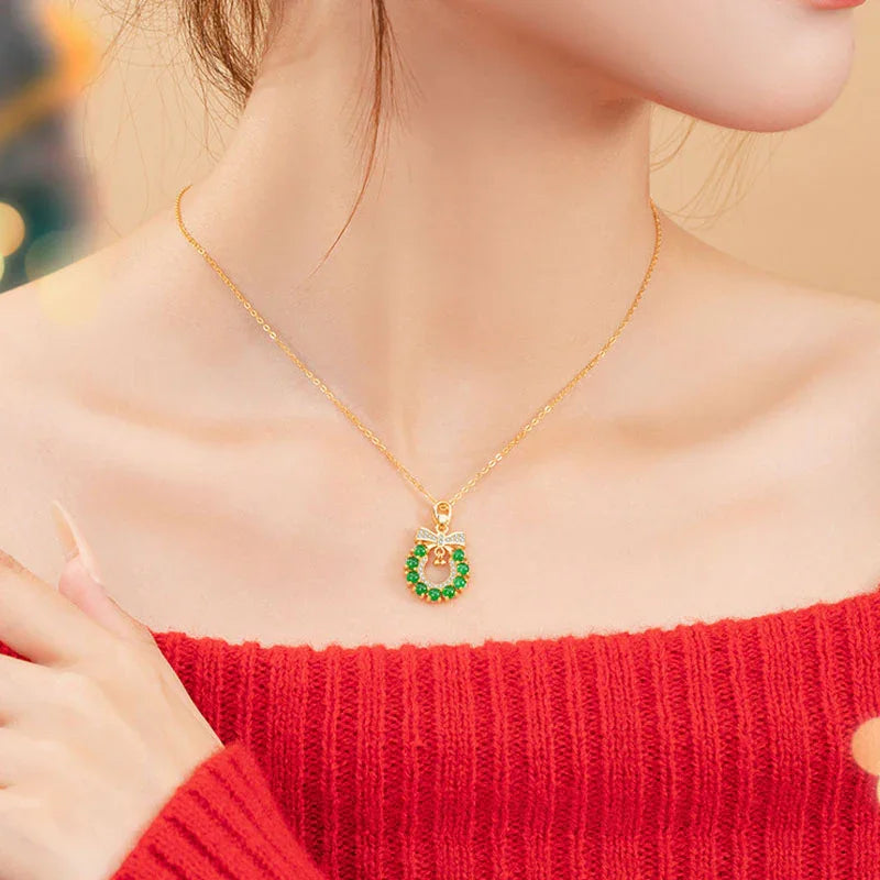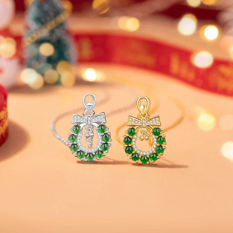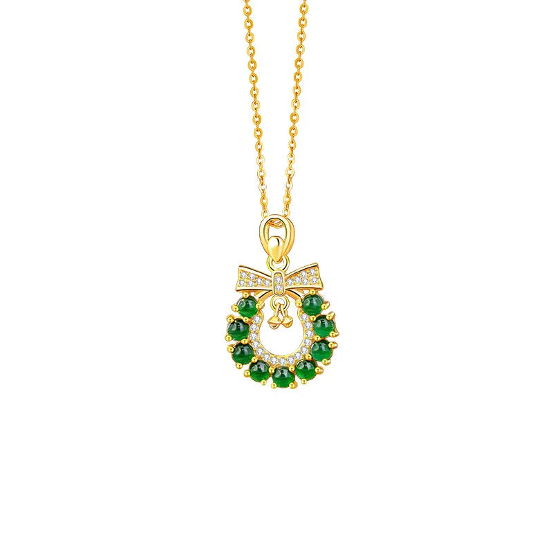 Celebrate the festive season with this enchanting Christmas Bell Jade Wreath Necklace. Inspired by holiday cheer, it features a delicate wreath design adorned with jade-like stones and a charming bell accent, capturing the essence of Christmas elegance.