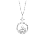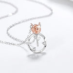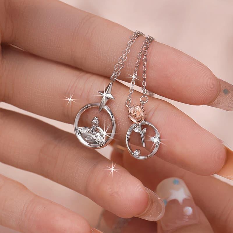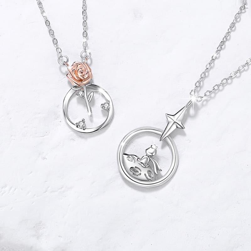 A pair of sterling silver couple necklaces. One pendant features a delicate rose with sparkling accents inside a circular frame, while the other shows a little prince figure sitting on a small planet beneath a star. Both are displayed on fine silver chains against a white background.