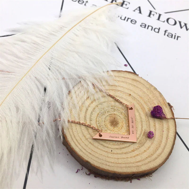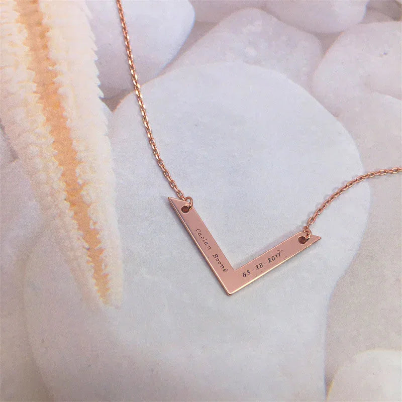 Make your story shine with our Personalized Name Necklace featuring a sleek V-shaped bar pendant. Modern and elegant, this necklace can be engraved with a name, date, or meaningful message, making it a cherished keepsake for everyday wear. The minimalist design complements both casual and formal looks, symbolizing individuality and connection.