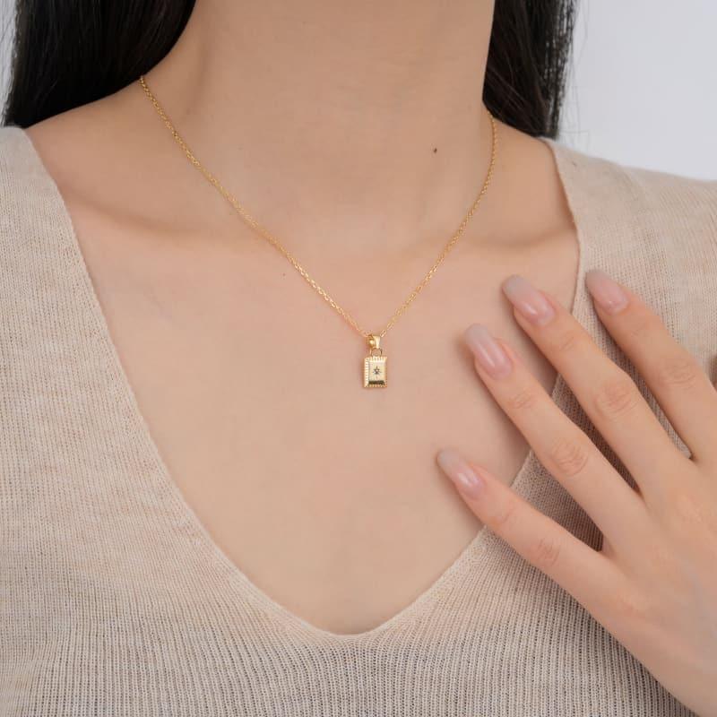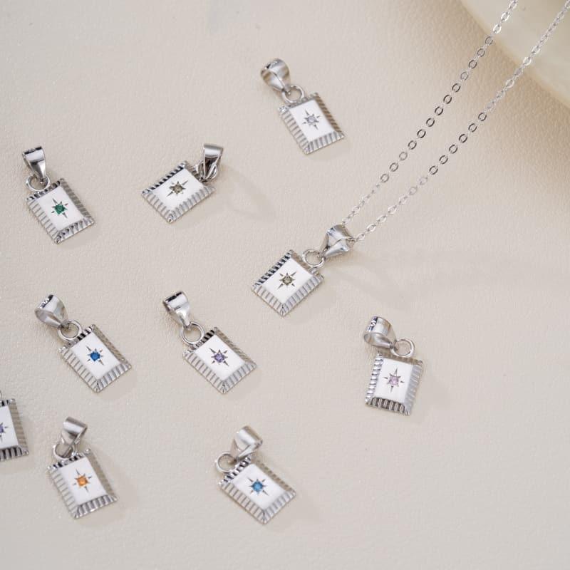 Inspired by the geometry of light and the sparkle of the stars, the Stellar Frame Birthstone Necklace blends modern design with timeless meaning. Each pendant features a hand-set birthstone at its center, framed by a structured rectangular border that catches light from every angle. Minimal yet captivating, it’s a piece that celebrates individuality and quiet elegance.