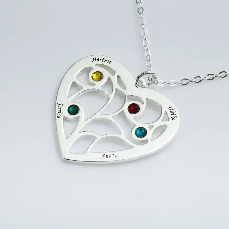 The Radiant Family Birthstone Necklace beautifully showcases the love shared between family members.Designed with an openwork heart shape and multiple vibrant birthstones, it brings each name and gemstone together in a meaningful way.