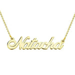A silver personalised name necklace featuring the name “Natacha” in an elegant cursive font, attached to a delicate chain.