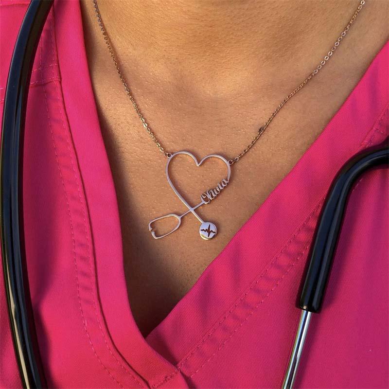 Celebrate compassion and dedication with our Personalized Stethoscope Name Necklace. Thoughtfully designed with a heart and stethoscope motif, this necklace beautifully symbolizes care and connection. The flowing script allows you to personalize it with a name, making it a meaningful accessory for healthcare professionals and those who inspire others through their kindness and service.