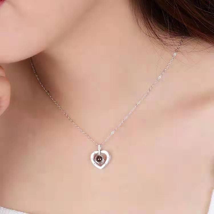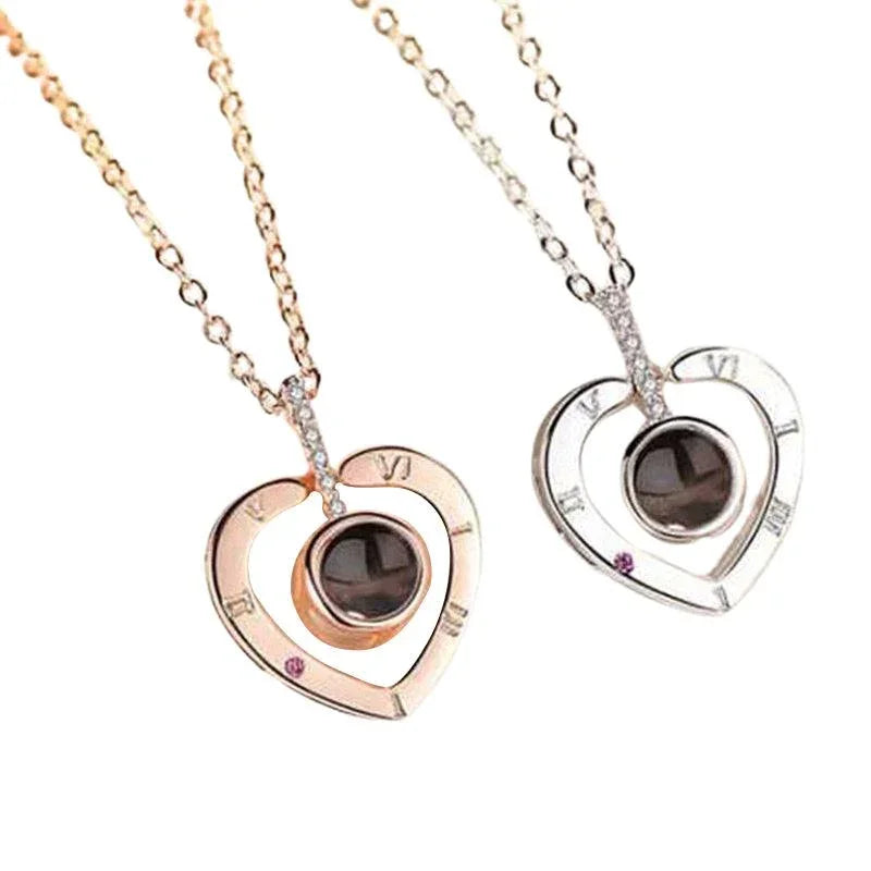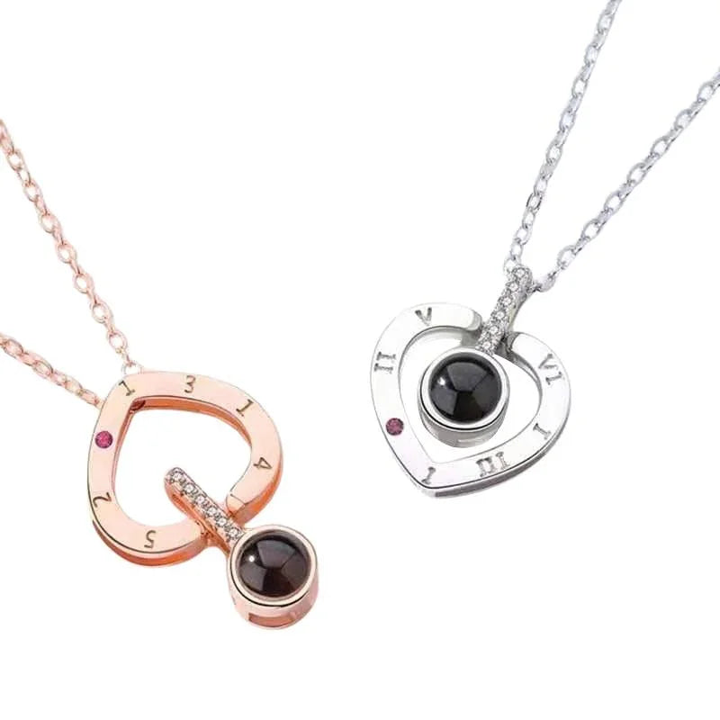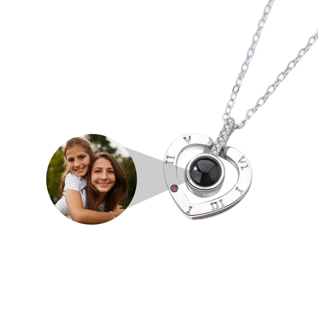 This elegant heart-shaped necklace features Roman numeral detailing and a sparkling photo projection charm—made to honor the unbreakable bond you share with someone special.