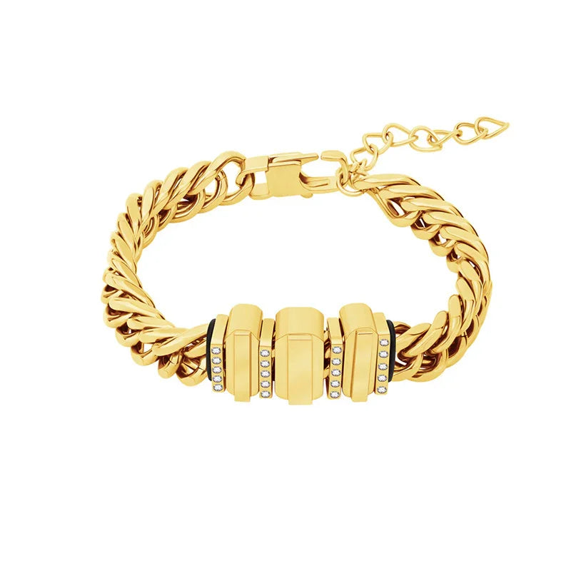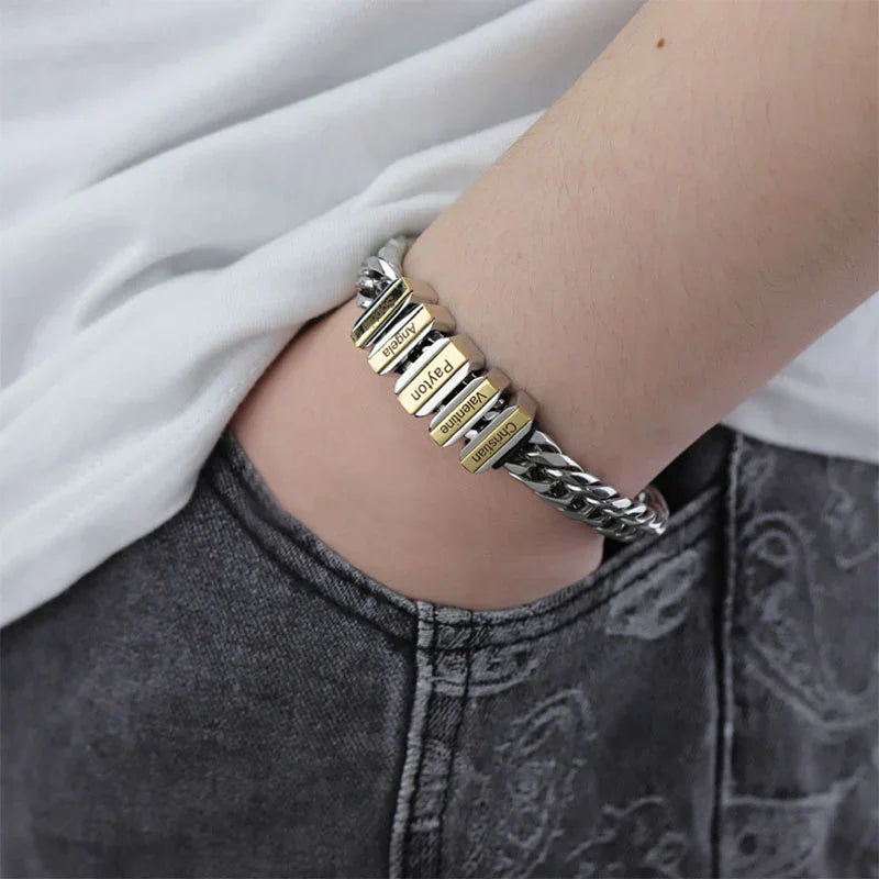 Celebrate the people who matter most with our Eternal Bond Personalized Nameplate Men’s Bracelet. Designed with bold nameplate beads, this bracelet allows you to engrave meaningful names, dates, or special words. Its polished two-tone finish paired with a solid chain creates a sleek yet powerful look, making it perfect for both everyday wear and formal occasions.